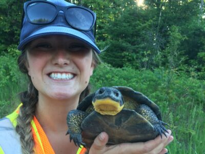 I check on the turtle through my binoculars again. Blanding’s Turtles can take up to 2.5 hours to complete the nesting process. To my excitement, there is a change in behaviour! She has finished digging. Her neck slowly extends out, showing off a beautiful yellow colour. Then she tucks her head in. This tells me that she is finally laying eggs! After each egg, she rocks sideways, catching the egg with one leg and placing it carefully into the nest. She will repeat this process, laying on average 10-15 eggs (Ernst et al. 1994).