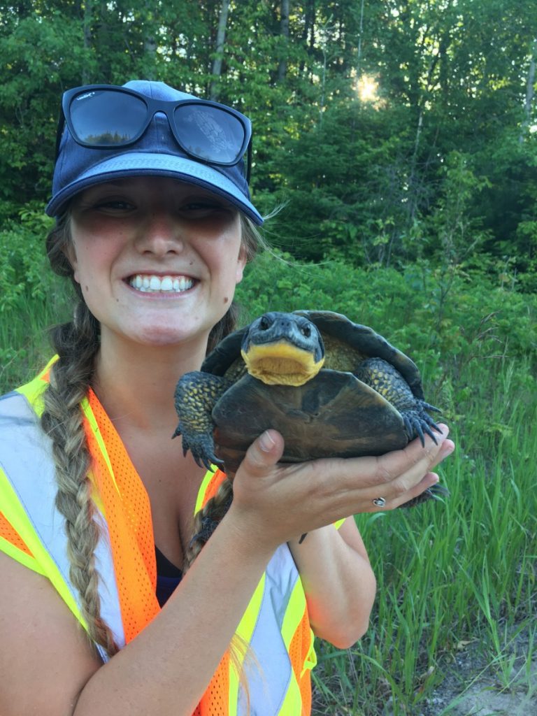 Its mid June in the Land Between. The evening temperature is pleasant, and I might even say I was comfortable sitting in this lawn chair on the side of the highway, if it weren’t for the bugs! Black-flies and mosquitoes swarm my head and unprotected arms. I pull on my trusty bug jacket and settle back into my seat. I’m watching a show that many people have not had the pleasure of seeing; a Blanding’s Turtle is laying her nest. I’m watching her from the other side of the road through my binoculars, ensuring her safety. This is a vulnerable time for her and I am protecting her from oncoming cars. A study in Southern Ontario showed that approximately 2.7% of cars will intentionally aim for reptiles on the road (Ashley et al. 2007). I won’t let that happen to this momma! She rocks slowly back and forth as she works to dig a hole. She has been working for about an hour now. I wonder if she’ll start laying before its dark! Like many other turtles, this mother is very methodical when it comes to nesting.