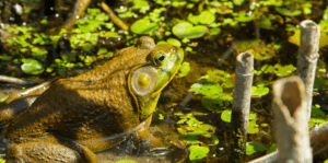 Green frogs (Rana clamitans) also have been introduced but are less menacing. We have many green frogs in the Land Between and some bullfrogs. Why don’t we have the problems seen in B.C.? Our other frogs have lived with bullfrogs over evolutionary time and have developed adaptations to prevent population decline due to bullfrog predation on their young. Possibly we also have predators that hold back the bullfrog population. Otters eat both bullfrogs and green frogs that the otters catch in winter on the muddy bottom and bring up to eat on the edge of the ice. The amphibian species native to B.C. have not had the benefit of adapting over a long time to the bullfrogs.