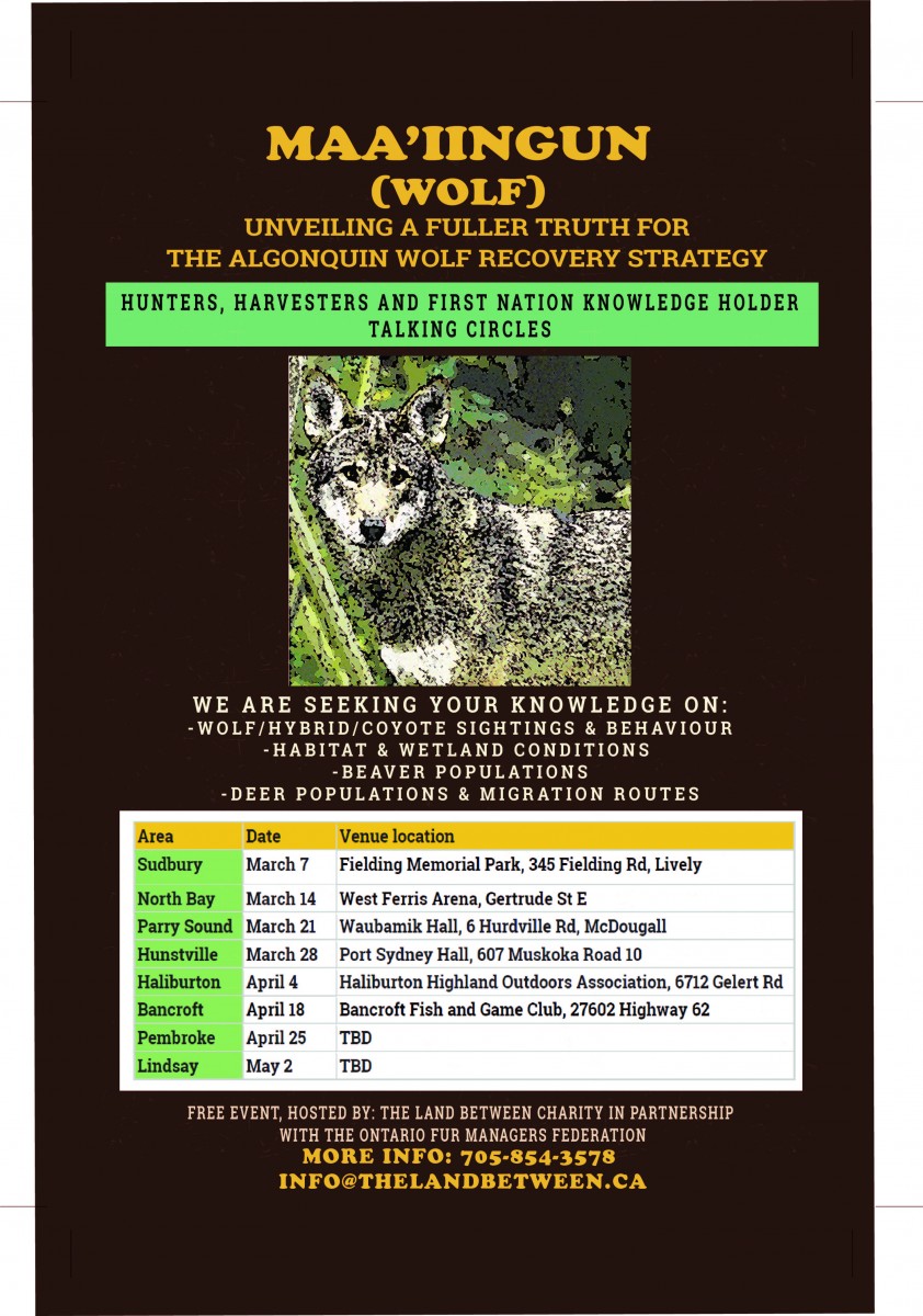 Talking Circles are for hunters, harvesters and First Nation Knowledge Holders, to share knowledge and observations, towards a more complete picture. Circles are led by Indigenous Elders and are delivered by The Land Between in partnership with the Ontario Fur Harvesters Federation. For more information or to find a circle near you, see below, or call Leora at 705-854-3578